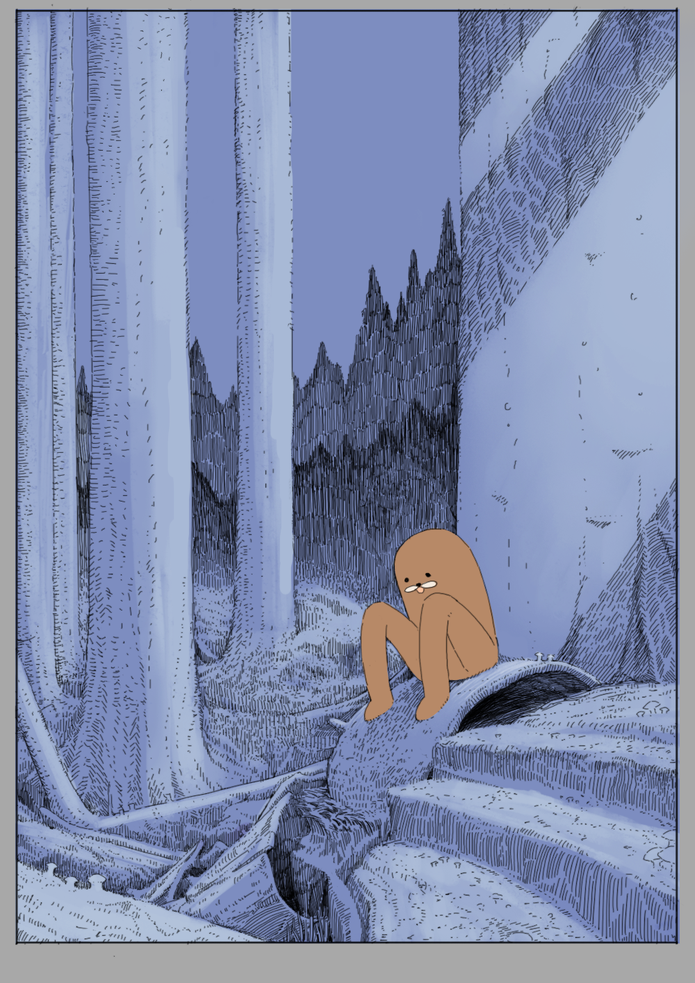 blue_theme border commentary english_commentary forest gondola_(meme) grey_border highres meme nature no_humans original outdoors sitting solo tree y_naf