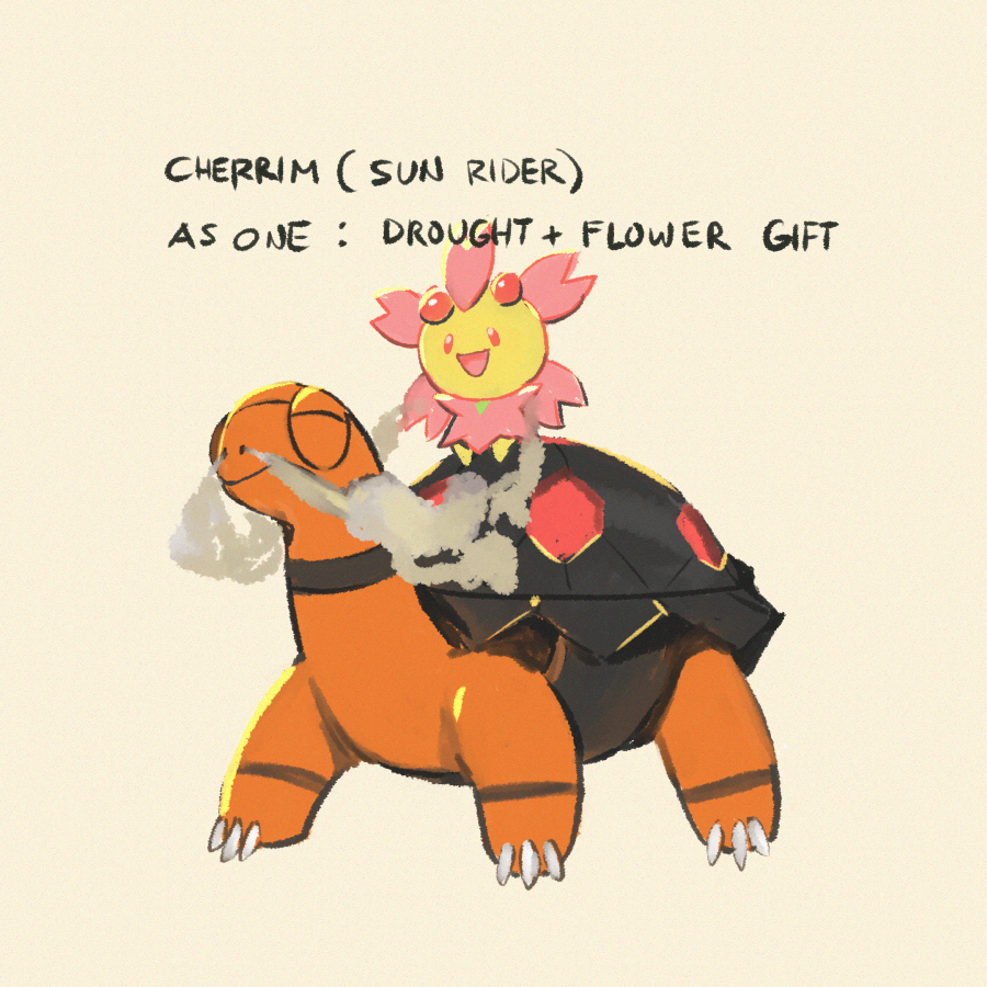 :d character_name cherrim cherrim_(sunshine) claws closed_eyes commentary english_commentary gen_3_pokemon gen_4_pokemon go-lurk nintendo no_humans open_mouth pink_eyes pokemon pokemon_(creature) riding riding_pokemon smile smoke standing tongue torkoal