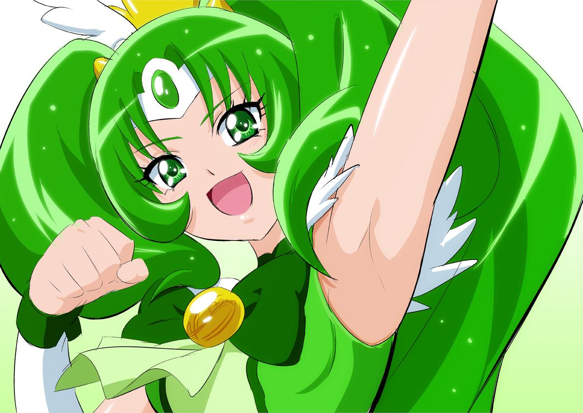 1girl :d arm_up armpits circlet cure_march detached_sleeves eyelashes fuchi_(nightmare) gradient_background green_background green_eyes green_hair green_neckwear green_theme green_vest hair_between_eyes hair_intakes long_hair looking_at_viewer open_mouth precure shiny_skin smile smile_precure! solo upper_body very_long_hair vest white_background white_sleeves