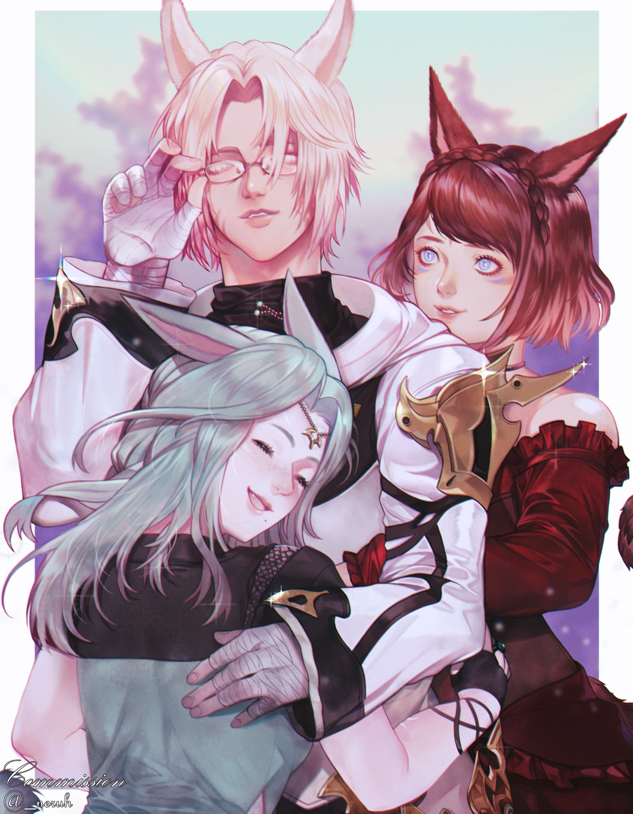 1boy 2girls absurdres adjusting_eyewear animal_ears bandaged_hand bare_shoulders blonde_hair blue_eyes blurry blurry_background cat_ears choker closed_eyes commission facial_mark final_fantasy final_fantasy_xiv fingerless_gloves frills glasses gloves grey_hair head_chain highres hug jewelry looking_at_another looking_at_viewer miqo'te multiple_girls noboru_ru red_hair rimless_eyewear short_hair swept_bangs upper_body warrior_of_light_(ff14) whisker_markings