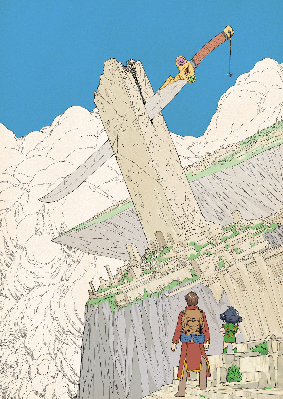 1boy 1girl backpack bag black_hair blue_sky boots brown_hair building coat commentary day double_bun english_commentary floating_island from_behind giant grand_scale grass hair_bun highres huge_weapon long_sleeves original outdoors red_coat ruins scenery sky skyscraper weapon wide_shot y_naf