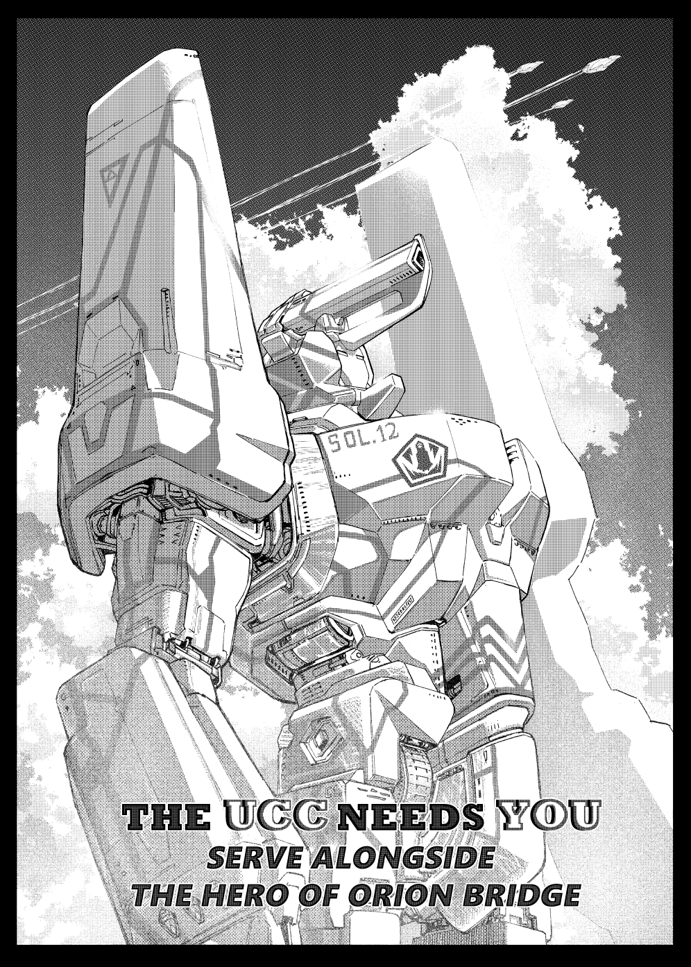 armor black_border border commentary contrail copyright_request english_commentary english_text greyscale highres mecha monochrome no_humans outdoors pauldrons robot shoulder_armor standing y_naf