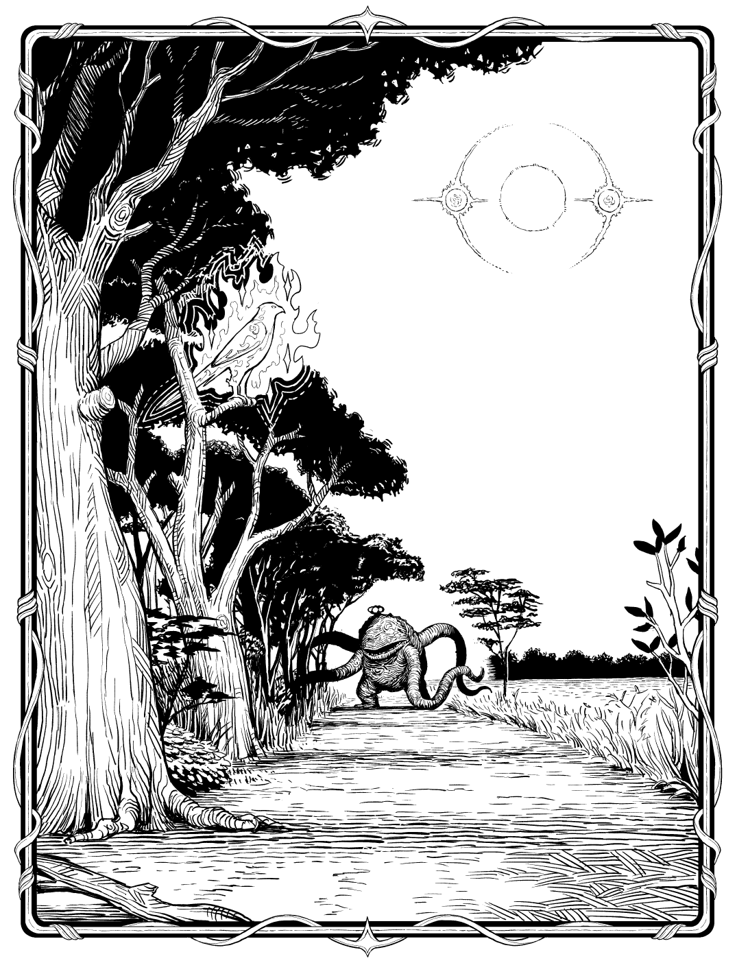 bird border grass greyscale highres monochrome monster no_humans original outdoors path phoenix road tree white_border y_naf