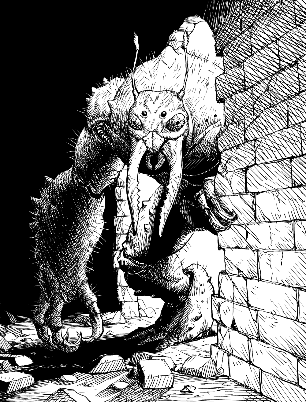 broken_wall claws compound_eyes debris greyscale highres horror_(theme) looking_at_viewer monochrome monster no_humans original y_naf