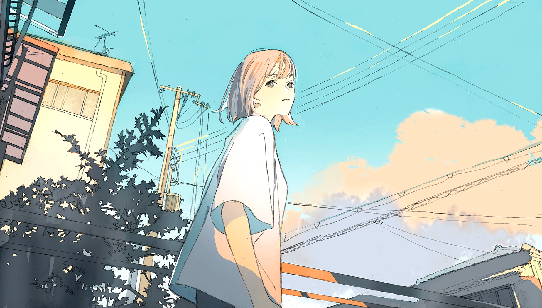 1girl blue_sky building closed_mouth cloud commentary_request from_side grey_eyes highres light_brown_hair looking_at_viewer original power_lines railing shirt short_hair short_sleeves sky solo tree upper_body utility_pole wamizu white_shirt