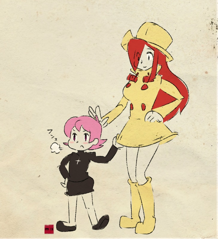 2girls boots breath brown_background chibi cosplay costume_switch cross cross_necklace hat headpat jewelry long_hair minawa108 multiple_girls necklace parasoul_(skullgirls) parasoul_(skullgirls)_(cosplay) pink_eyes pink_hair raincoat red_hair short_hair siblings sisters skirt skullgirls sweater turtleneck turtleneck_sweater umbrella_(skullgirls) umbrella_(skullgirls)_(cosplay)