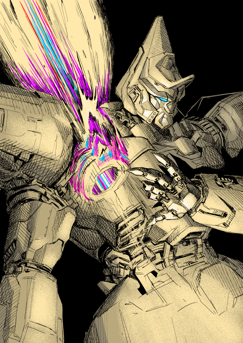 black_background commentary copyright_request english_commentary explosion highres mecha no_humans robot simple_background spot_color upper_body y_naf