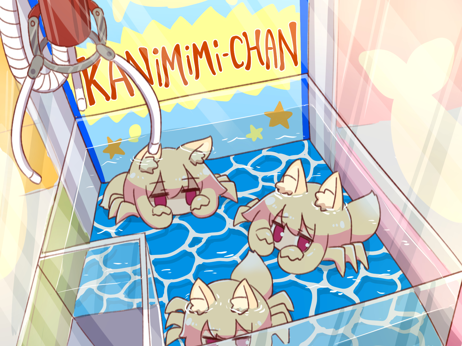 3girls animal animal_ear_fluff animal_ears animal_print animalization blonde_hair carcinization commentary crab crane_game empty_eyes fish_print fox_ears fox_tail hair_between_eyes highres kemomimi-chan_(naga_u) multiple_girls naga_u original partially_submerged red_eyes shaded_face star_(symbol) tail water