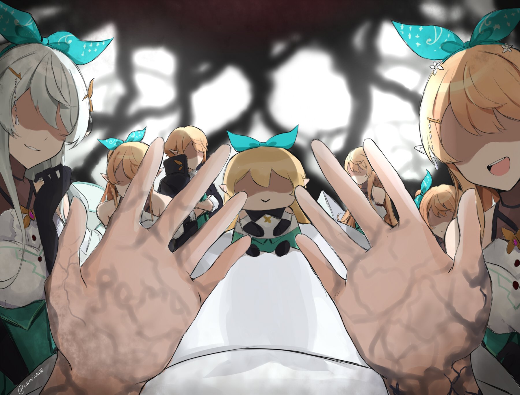 1other 6+girls bare_shoulders black_gloves blonde_hair bow character_name chibi coat commentary dress elbow_gloves english_commentary faceless faceless_female gloves green_ribbon green_skirt grey_hair hair_bow hands_up highres lendivere long_hair multiple_girls multiple_persona nijisanji nijisanji_en no_eyes open_mouth pointy_ears pomu_rainpuff pomu_rainpuff_(1st_costume) popped_collar pov ribbon shaded_face skirt smile smille smirk virtual_youtuber walfie_(style)