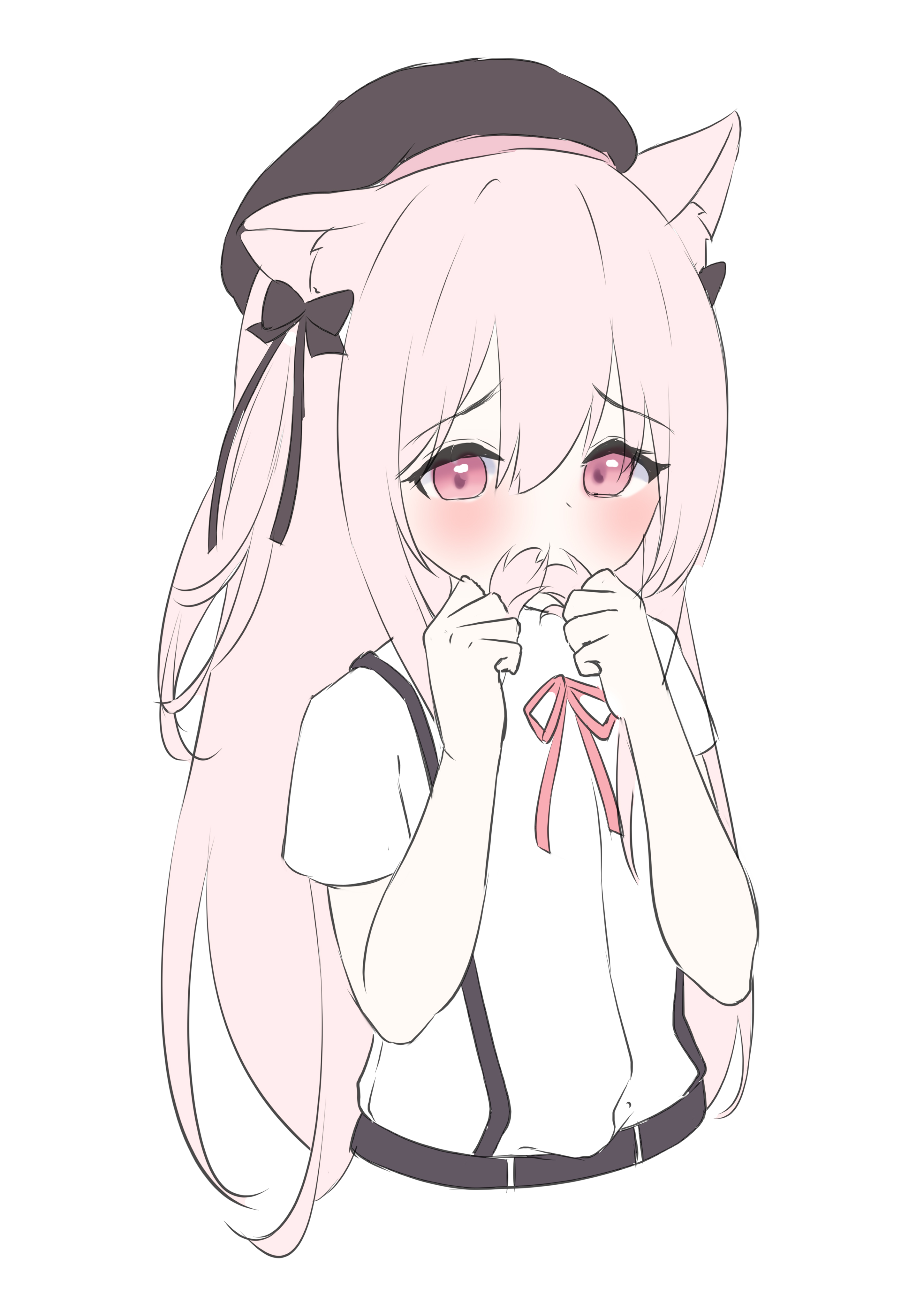 1girl absurdres animal_ear_fluff animal_ears azur_lane beret black_bow black_hat black_skirt bow cat_ears covered_mouth cropped_torso hair_between_eyes hair_bow hands_up hat highres holding holding_own_hair kisaragi_(azur_lane) kisaragi_(retrofit)_(azur_lane) long_hair looking_at_viewer neck_ribbon one_side_up pink_hair red_eyes red_ribbon ribbon roido_(taniko-t-1218) shirt short_sleeves simple_background skirt solo suspender_skirt suspenders upper_body very_long_hair white_background white_shirt