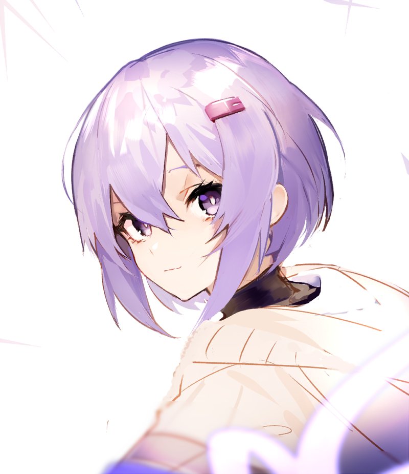 1girl a.i._voice brown_cardigan cardigan commentary from_side hair_ornament hairclip light_smile looking_at_viewer portrait purple_eyes purple_hair short_hair solo v_cho3 vocaloid voiceroid white_background yuzuki_yukari yuzuki_yukari_(shizuku)