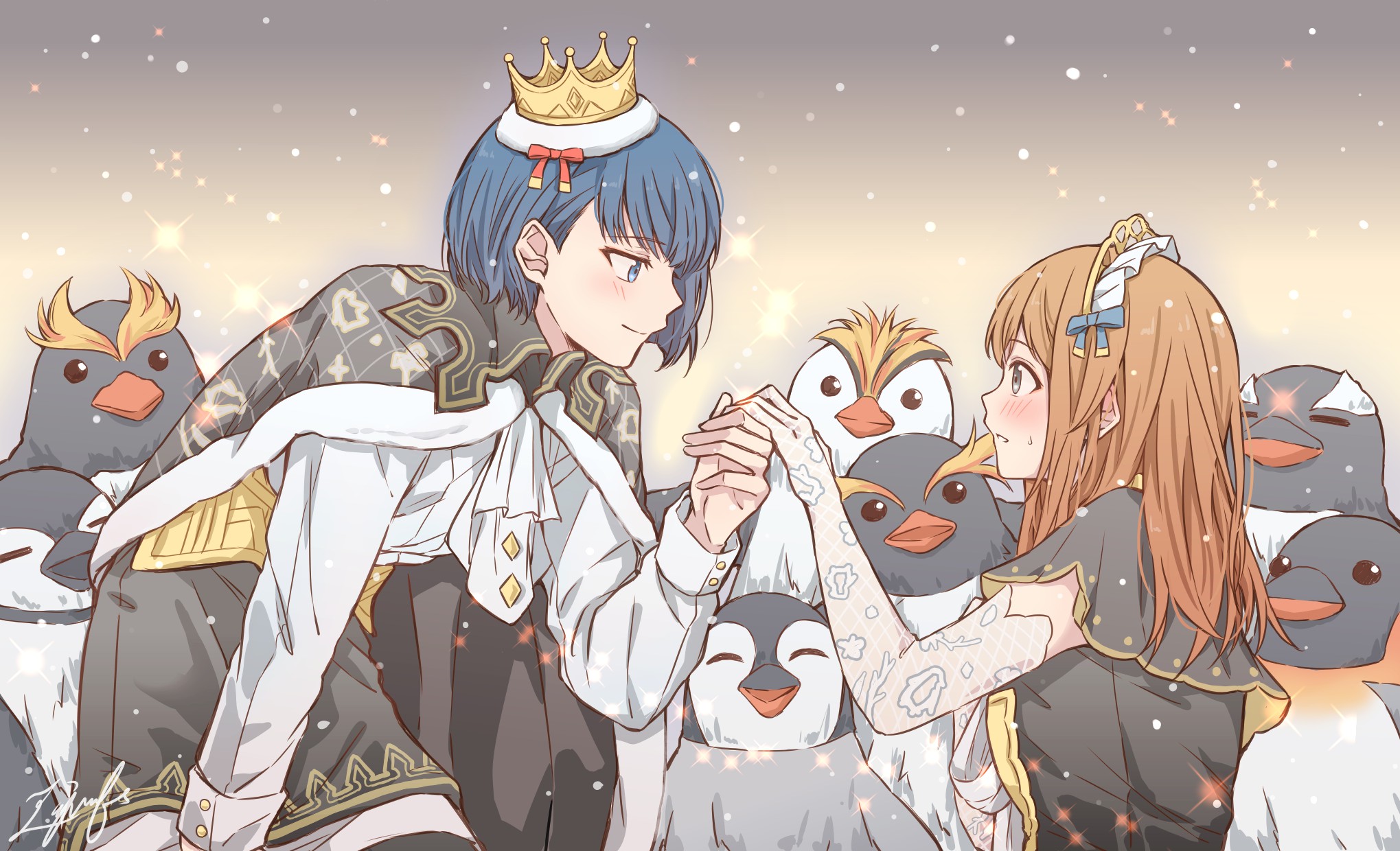 2girls a_(phrase) aiiro_bokujuu bird black_cape black_dress black_skirt blue_eyes blue_hair blush brown_hair cape character_request closed_mouth copyright_request crown dress elbow_gloves eye_contact fur-trimmed_cape fur_trim gloves grey_eyes hair_behind_ear highres holding_hands lace lace_gloves long_hair long_sleeves looking_at_another mini_crown multiple_girls parted_lips penguin shirt short_hair skirt smile sparkle untranslatable_commentary tiara white_gloves white_shirt yuri