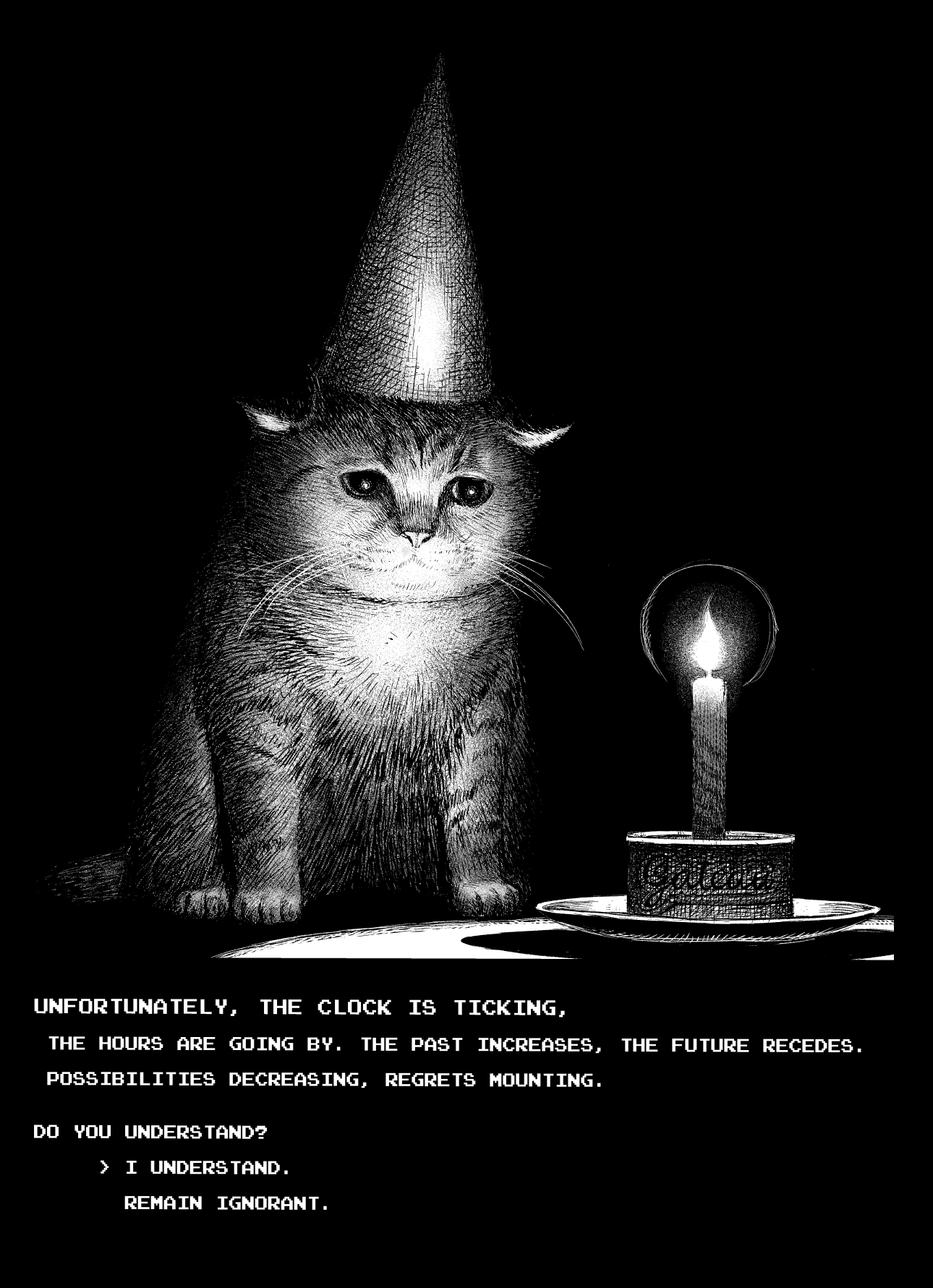animal_focus arrow_(symbol) black_background candle cat commentary dialogue_options english_commentary english_text fire fire greyscale hat highres meme monochrome no_humans original party_hat plate sad simple_background white_background y_naf