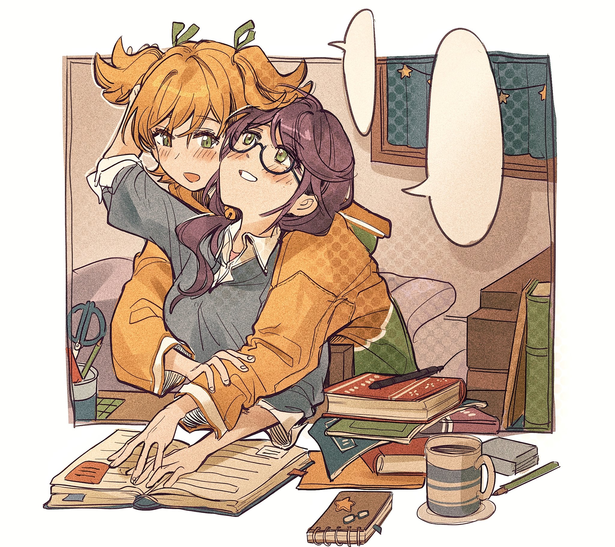 2girls blush book book_stack coffee_mug commentary_request cup daiba_nana desk glasses green_eyes grey_shirt highres hood hood_down hoodie hoshimi_junna hug hug_from_behind indoors jiaochunhaochi long_hair long_legs mug multiple_girls notebook open_book open_mouth orange_hair orange_hoodie pen pencil purple_hair scissors shirt short_hair shoujo_kageki_revue_starlight sleeves_rolled_up smile speech_bubble teeth two_side_up window yuri