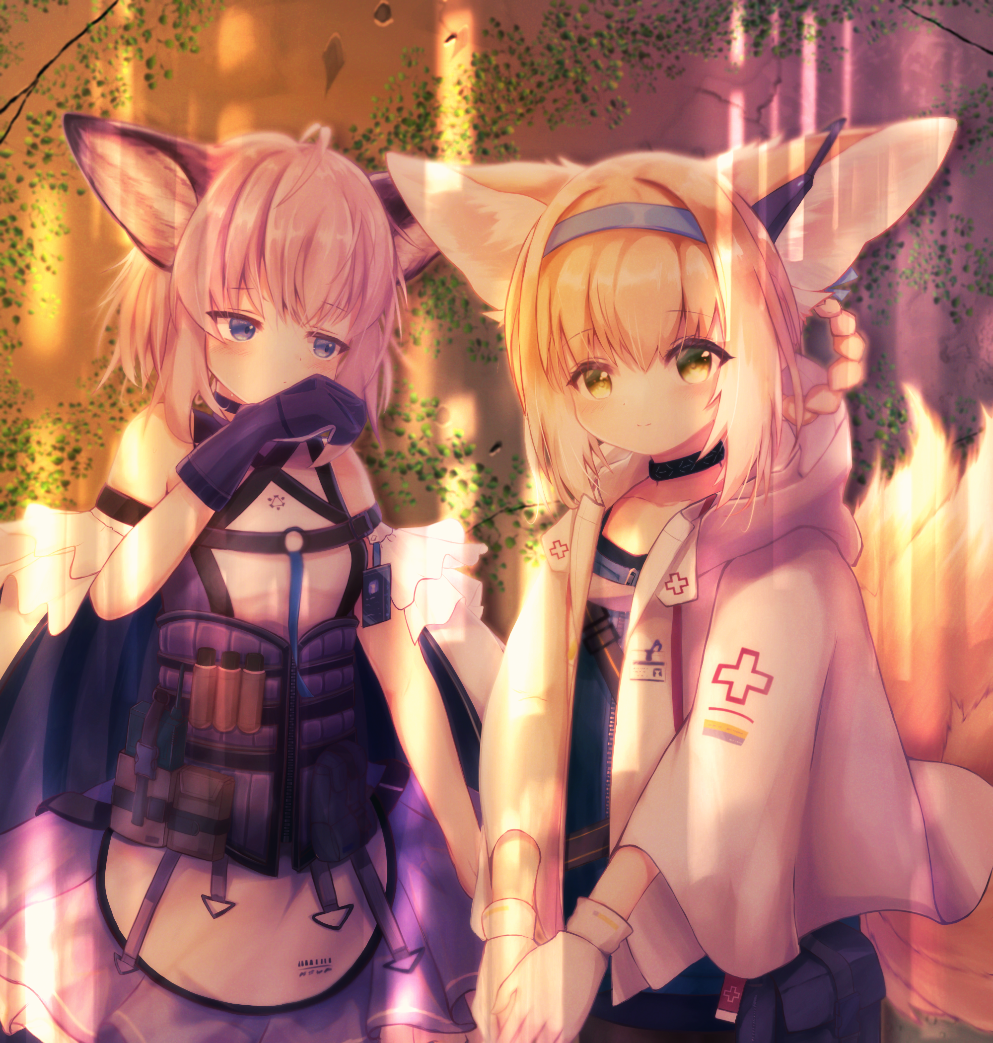 2girls ahoge animal_ears arknights bad_id bad_pixiv_id black_collar black_legwear blonde_hair blue_eyes blue_hairband blue_shirt blush braid brown_hair chrocatz collar commentary_request cosplay costume_switch dress earpiece fox_ears fox_girl fox_tail gloves green_eyes hairband highres infection_monitor_(arknights) jacket kitsune light_rays looking_at_viewer multicolored_hair multiple_girls multiple_tails open_clothes open_jacket outdoors pantyhose pouch purple_dress shirt short_hair sidelocks smile streaked_hair sussurro_(arknights) suzuran_(arknights) tactical_clothes tail two-tone_dress vest vial white_dress white_gloves white_hair white_jacket