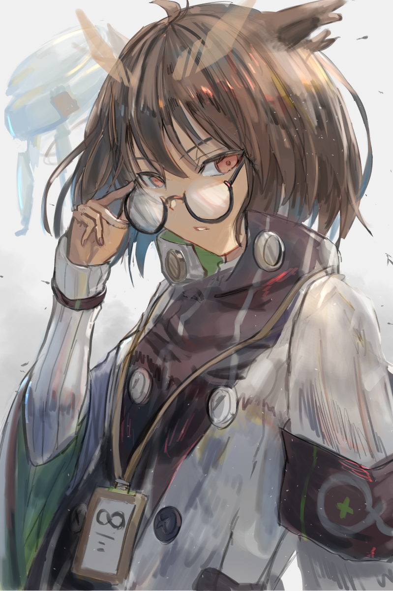 1girl adjusting_eyewear ahoge arknights armband black_coat buttons coat commentary_request drone feather_hair grey_background hair_between_eyes hand_on_eyewear hand_up highres id_card looking_at_viewer multicolored_coat owl_ears red_eyes rhine_lab_logo semi-rimless_eyewear short_hair silence_(arknights) simple_background solo two-tone_coat under-rim_eyewear upper_body uutan_(shibainu_kakumei) white_coat