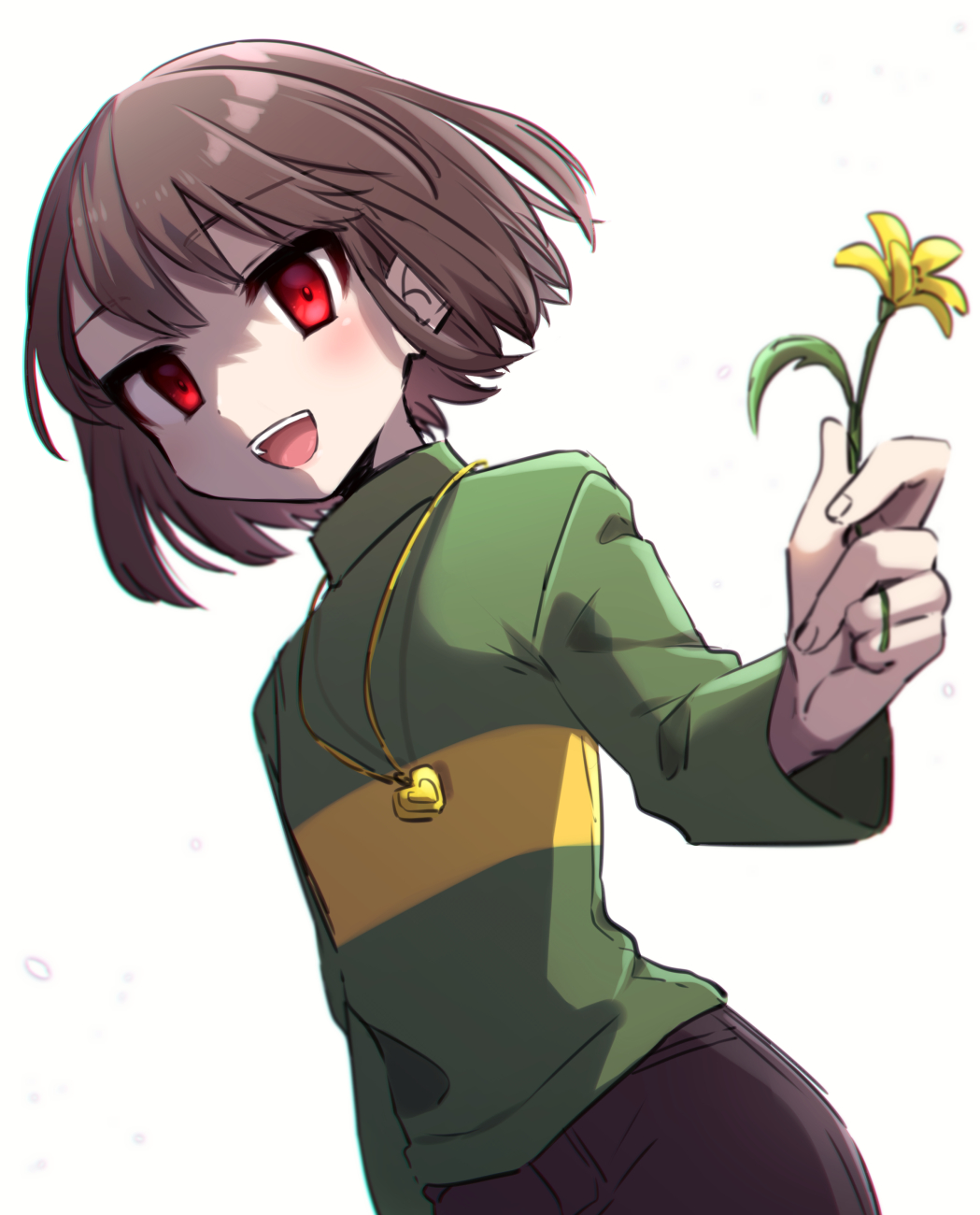 1other blush bob_cut brown_hair brown_pants chara_(undertale) cowboy_shot dutch_angle flower gold_necklace green_shirt hand_up heart heart_necklace highres holding holding_flower jewelry leftporygon long_sleeves looking_at_viewer multicolored_shirt necklace open_mouth pants red_eyes shirt short_hair simple_background smile solo swept_bangs teeth turtleneck undertale upper_teeth_only utdr_(toby_fox) white_background yellow_flower yellow_shirt