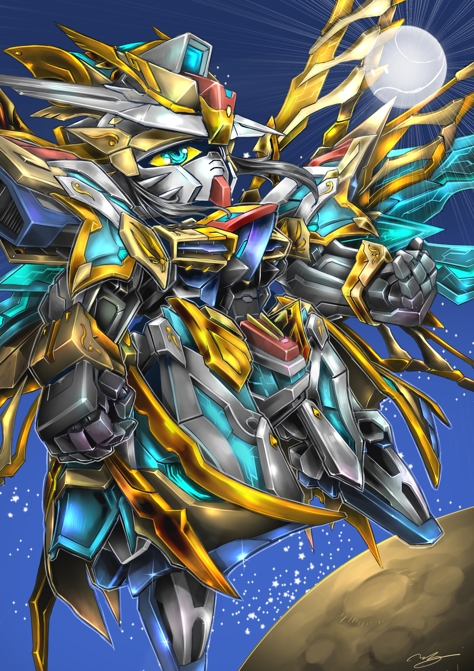 blue_eyes clenched_hand colored_sclera denjyou23 floating gundam haro highres leaning_back looking_up mecha moon no_humans robot sd_gundam sd_gundam_world_heroes signature solo strike_freedom_gundam v-fin yellow_sclera zhuge_liang zhuge_liang_freedom_gundam