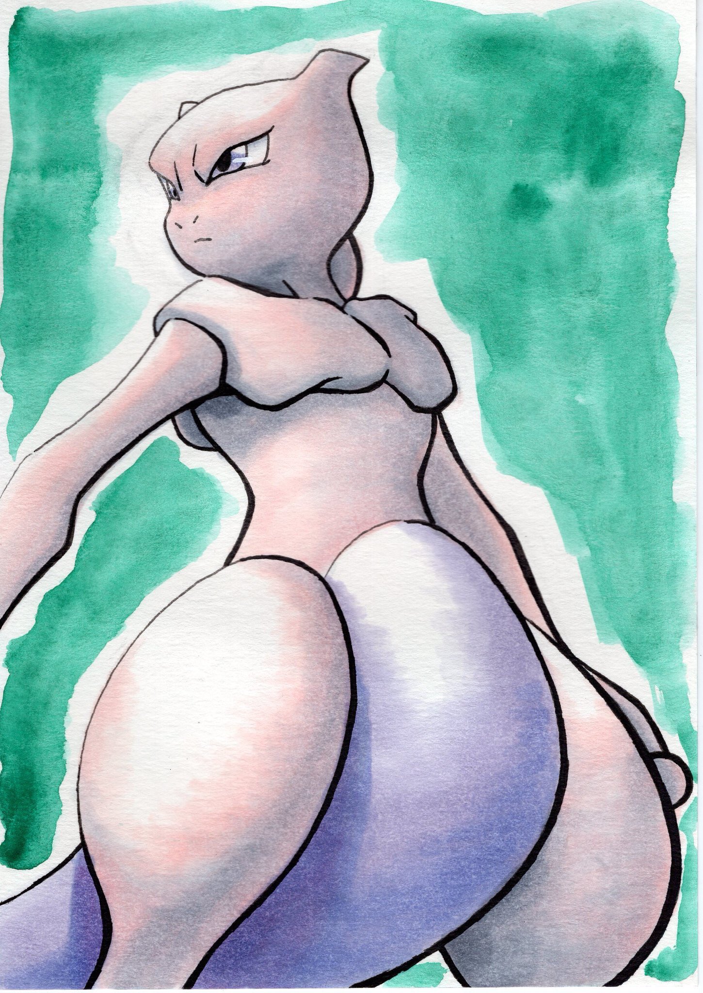 closed_mouth commentary_request from_below frown gen_1_pokemon green_background grey_eyes highres legendary_pokemon looking_to_the_side mewtwo nintendo oka_mochi pokemon pokemon_(creature) solo traditional_media
