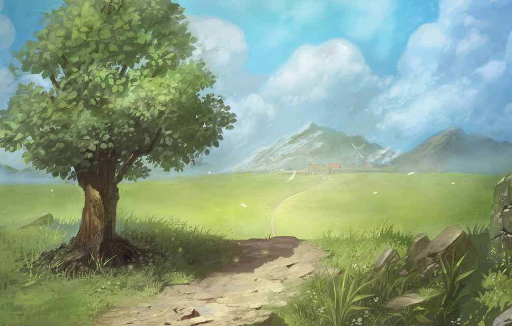 blue_sky cloud cloudy_sky commentary_request day gargadia_empire grass landscape mountain no_humans outdoors pixiv_fantasia pixiv_fantasia_5 plant puyoakira rock scenery sky tree very_wide_shot