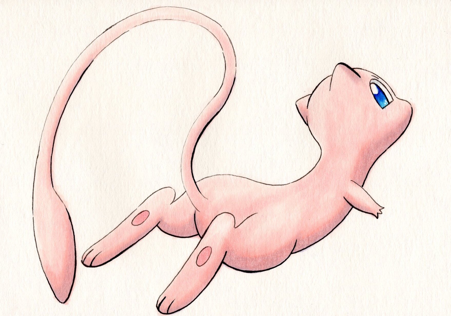 blue_eyes commentary_request full_body gen_1_pokemon grey_background highres legendary_pokemon looking_back mew_(pokemon) mythical_pokemon nintendo no_humans oka_mochi pokemon pokemon_(creature) pokemon_focus solo toes traditional_media