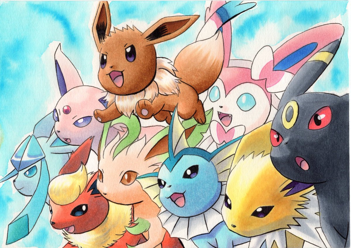 :d blue_background blue_eyes commentary_request eevee espeon evolutionary_line fangs flareon gen_1_pokemon gen_2_pokemon gen_4_pokemon gen_6_pokemon glaceon jolteon jumping leafeon nintendo no_humans oka_mochi open_mouth pokemon pokemon_(creature) smile sylveon toes tongue traditional_media umbreon vaporeon