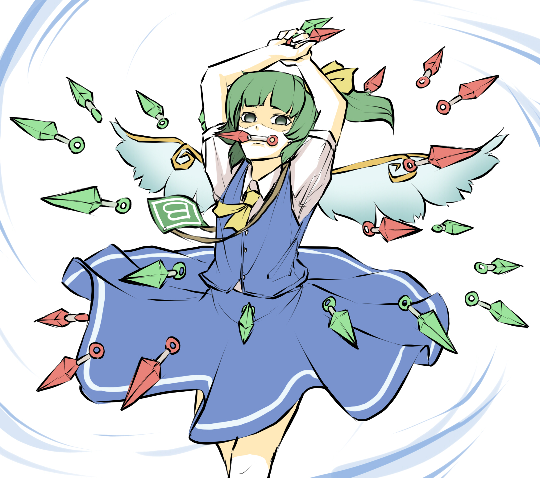 1girl arms_up ascot between_fingers blue_skirt blue_vest daiyousei danmaku fairy_wings green_eyes green_hair highres holding kunai looking_at_viewer mouth_hold peroponesosu. power-up puffy_short_sleeves puffy_sleeves shaded_face shirt short_sleeves side_ponytail simple_background skirt solo touhou vest weapon white_background white_shirt wings yellow_ascot