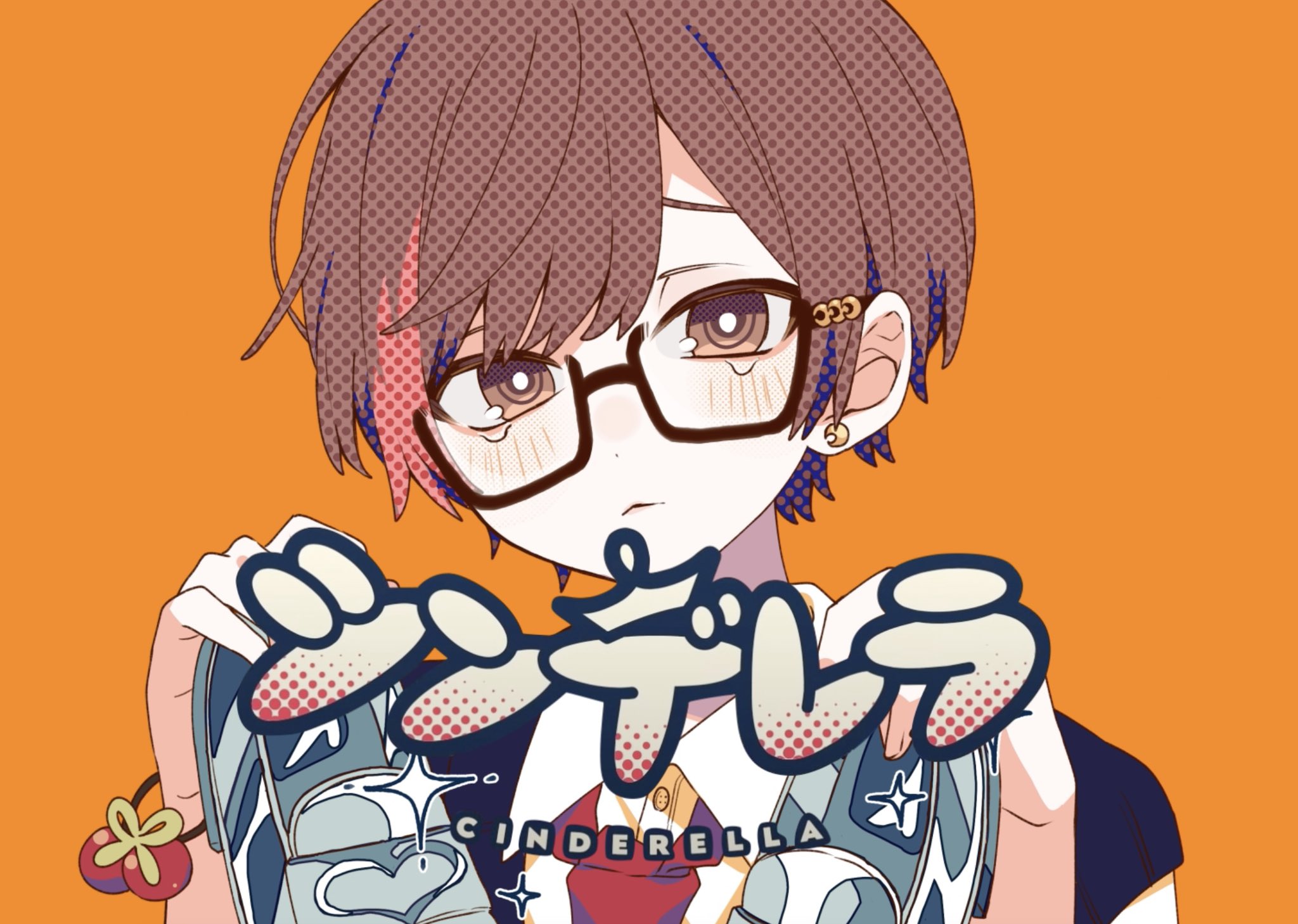 1girl brown_eyes brown_hair cinderella_(vocaloid) commentary_request glasses highres holding holding_shoes holding_unworn_clothes indie_utaite looking_at_viewer loose_necktie necktie official_art orange_background original red_necktie second-party_source shiroko_(purinkirin) shirt shoes short_hair simple_background solo song_name tears unworn_shoes vocaloid white_shirt wing_collar