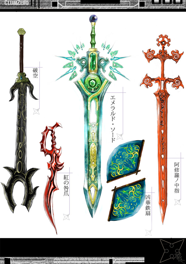 commentary_request fantasy folding_fan hand_fan knife long_sword no_humans original ross_(clumzero) simple_background still_life sword translation_request weapon weapon_focus