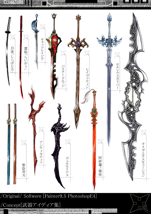 commentary_request double_blade english_text fantasy katana long_sword no_humans original ross_(clumzero) shuriken simple_background still_life sword translation_request weapon weapon_focus weapon_request white_background