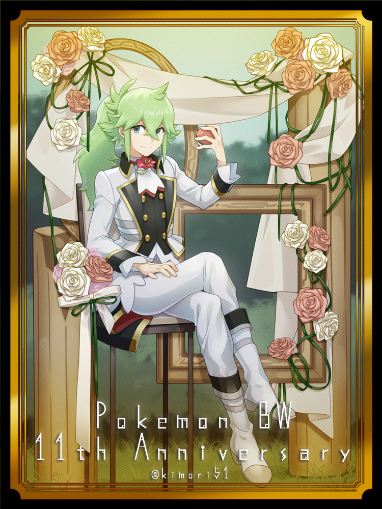 1boy anniversary ascot boots buttons chair closed_mouth commentary_request crossed_legs flower green_hair hair_between_eyes hand_on_own_thigh hand_up holding holding_poke_ball jacket long_hair long_sleeves male_focus n_(anniversary_2021)_(pokemon) n_(pokemon) nagiru nintendo official_alternate_costume pants poke_ball pokemon pokemon_masters_ex sitting smile solo white_boots white_jacket white_neckwear white_pants