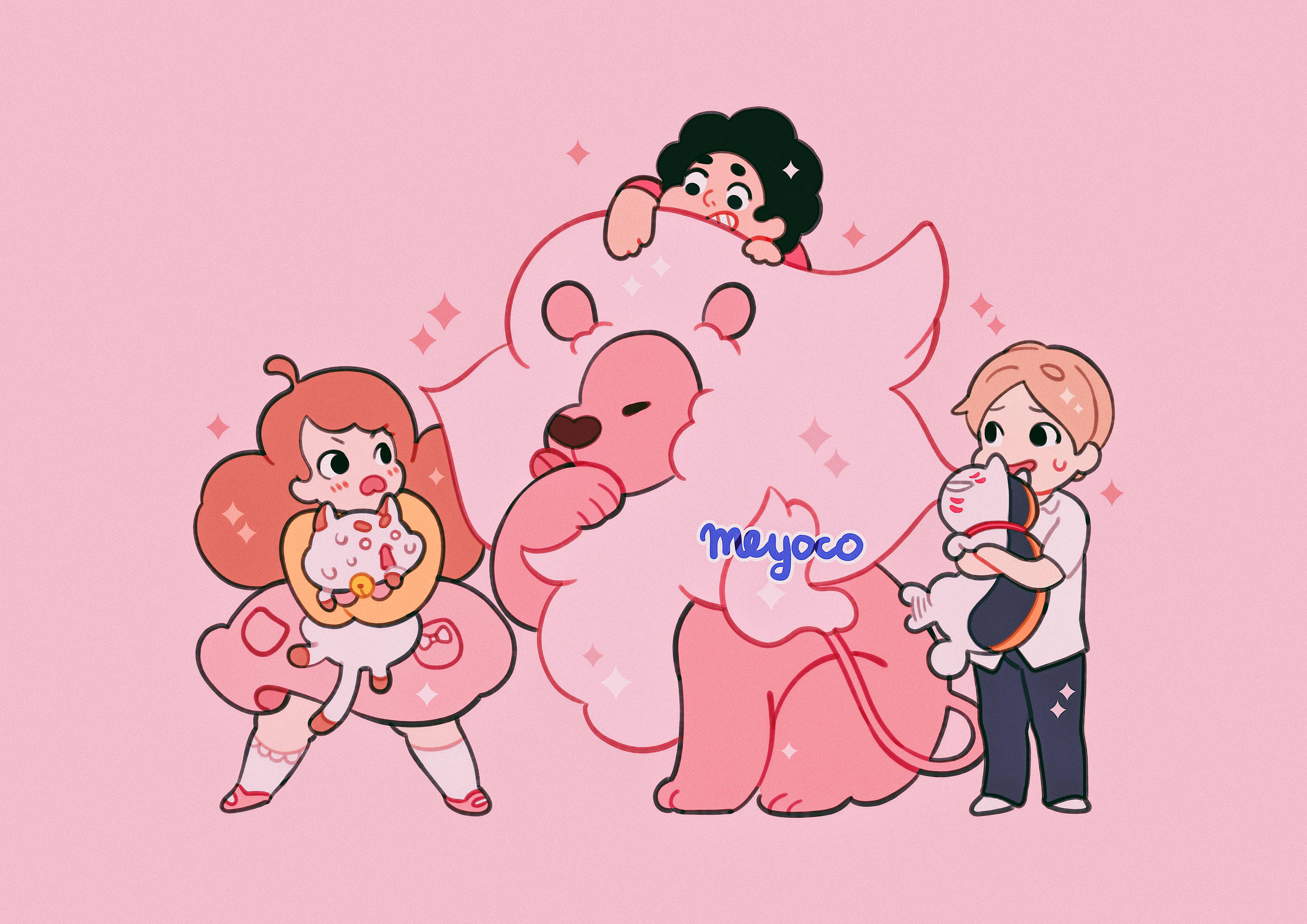 1girl 2boys absurdres animal bee_(bee_and_puppycat) bee_and_puppycat black_hair blonde_hair brown_hair cat highres lion lion_(steven_universe) madara_(natsume_yuujinchou) meyoco multiple_boys natsume_takashi natsume_yuujinchou no_nose pink_background pink_theme puppycat simple_background sparkle steven_quartz_universe steven_universe