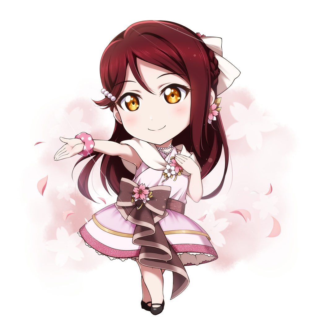 1girl artist_name artist_request bare_legs black_shoes blush bow braid breasts brown_bow brown_eyes chibi crown_braid dress dress_bow earrings female_focus flower flower_earrings full_body hair_between_eyes hair_bobbles hair_bow hair_ornament hair_ribbon half_updo jewelry long_hair looking_at_viewer love_live! love_live!_school_idol_festival love_live!_sunshine!! miniskirt necklace orange_eyes parted_lips pearl_necklace petals pink_flower pink_petals pink_scrunchie pink_skirt plaid_clothes plaid_dress plaid_skirt pleated pleated_dress pleated_skirt polka_dot polka_dot_scrunchie red_hair ribbon sakurauchi_riko scrunchie shoes skirt smile solo white_background white_bow white_ribbon wrist_scrunchie yellow_eyes