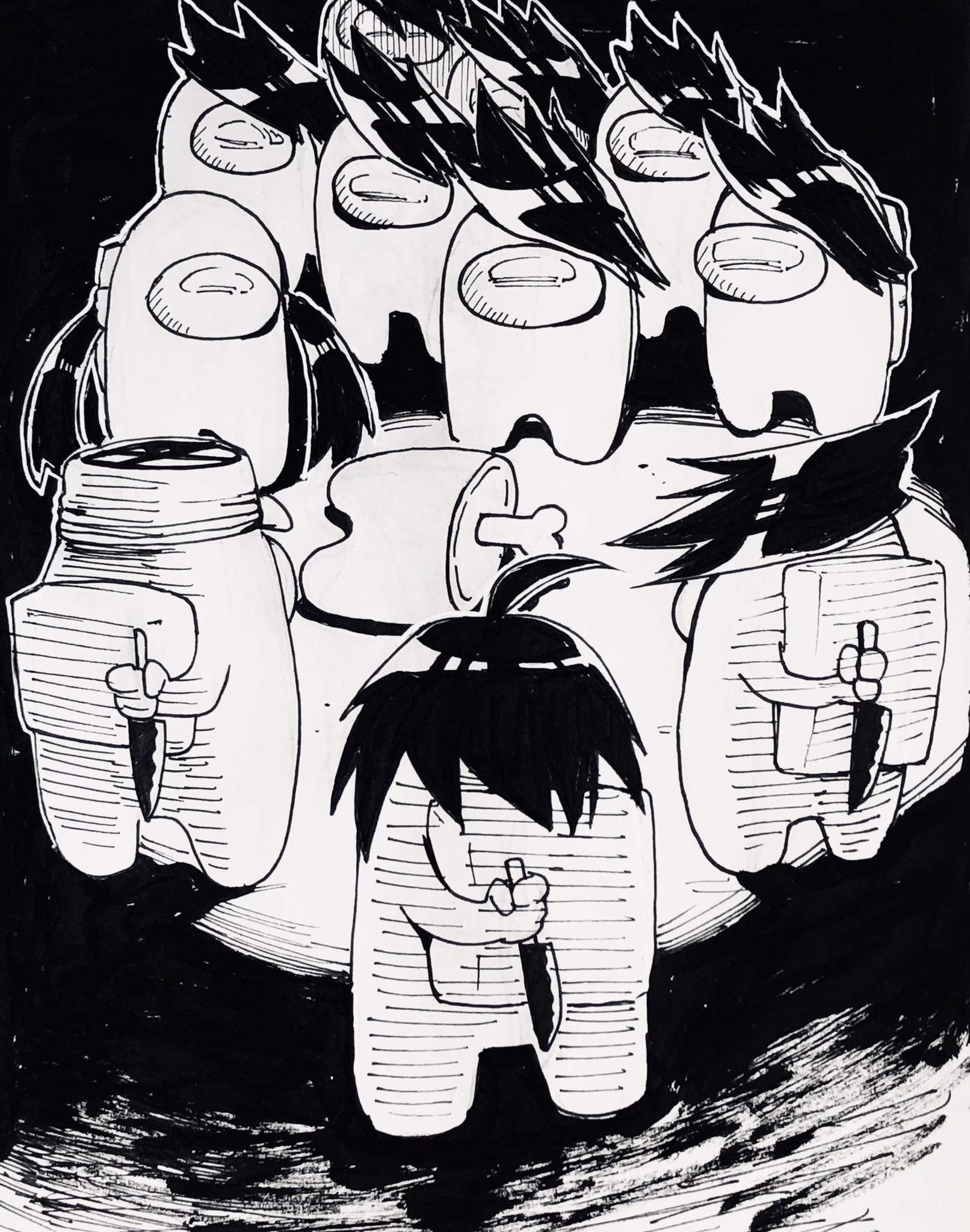 ahoge among_us arm_behind_back backpack bag black_background bone commentary_request corpse cosplay crewmate_(among_us) danganronpa_(series) danganronpa_v3:_killing_harmony from_behind greyscale harukawa_maki harukawa_maki_(cosplay) hat highres holding holding_knife impostor_(among_us) knife looking_at_another momota_kaito momota_kaito_(cosplay) monochrome saihara_shuichi_(cosplay) saihara_shuichi shinguji_korekiyo shinguuji_korekiyo_(cosplay) short_hair tsunemi_aosa twintails white_background