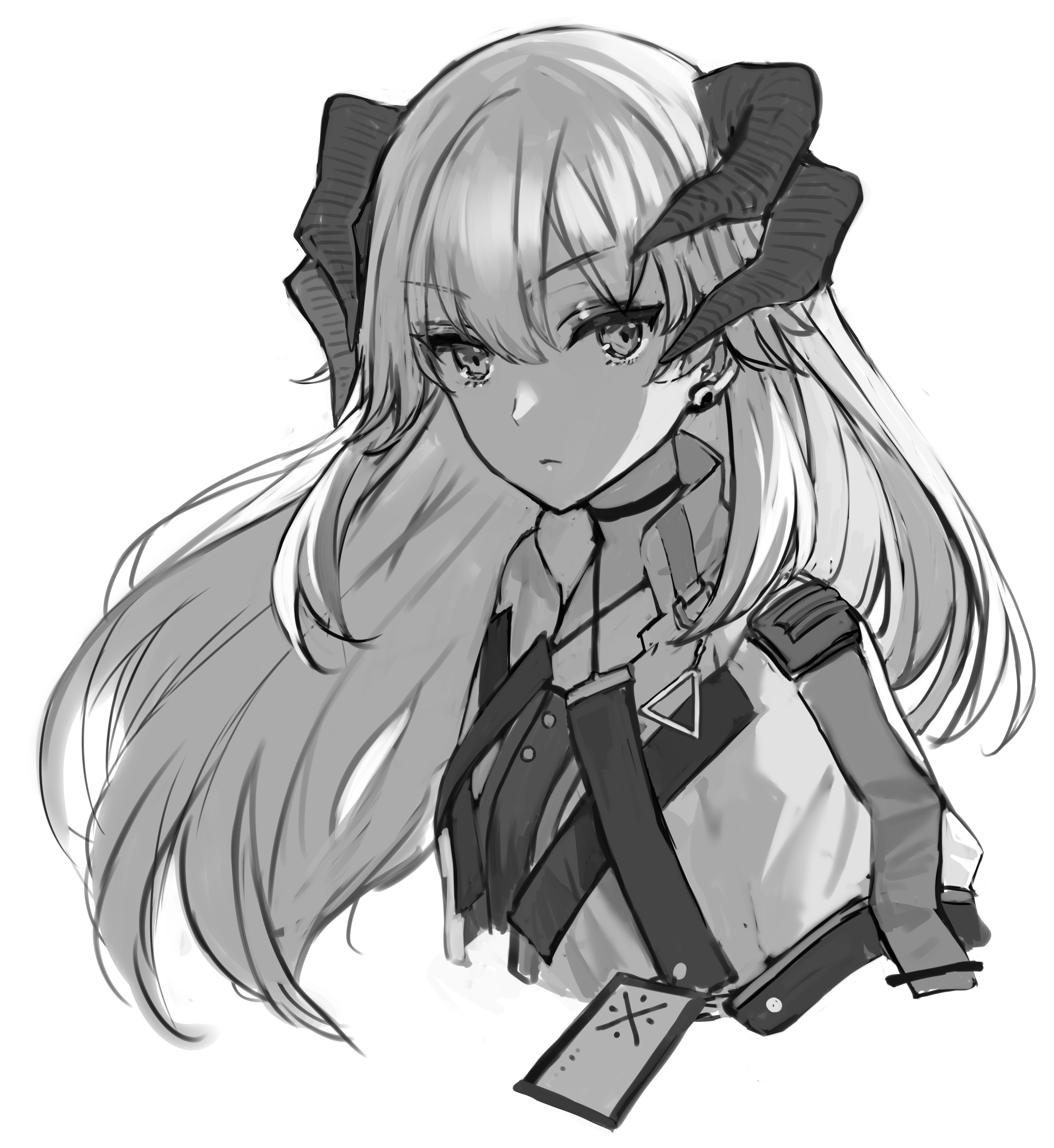 1girl absurdres apt arknights choker closed_mouth commentary_request cropped_torso dragon_horns earclip frown greyscale highres horns long_hair looking_at_viewer monochrome saria_(arknights) shirt solo unfinished upper_body v-shaped_eyebrows