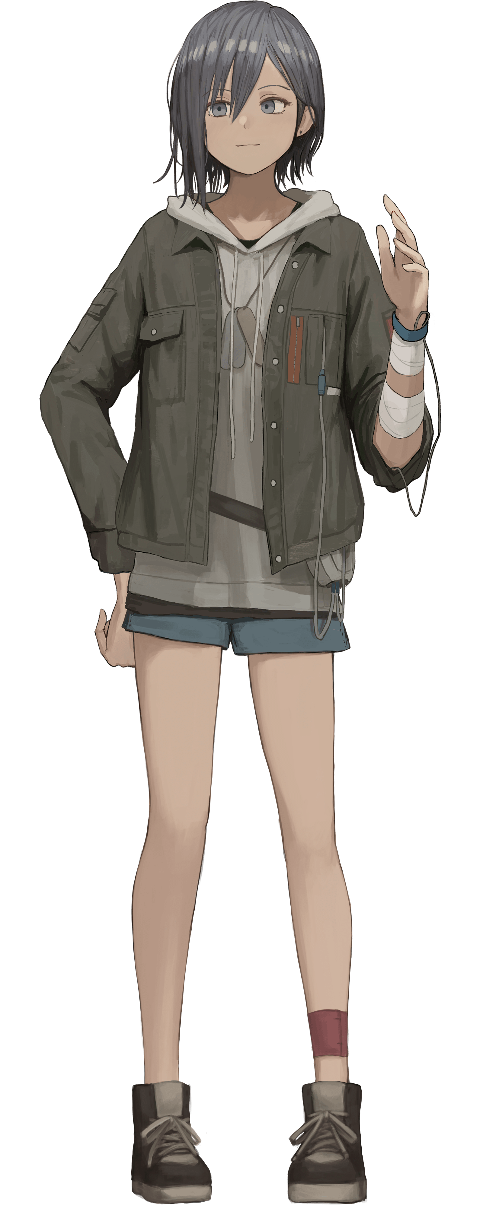 1girl absurdres ankleband asatsugutori asymmetrical_hair bandages bandaged_arm bandages blue_eyes blue_hair dog_tags earrings full_body hair_between_eyes highres hood hood_down hoodie jacket jewelry karin_(asatsugutori) official_art open_clothes open_jacket shion_(mirudakemann) shoes short_hair shorts smile sneakers solo stud_earrings tachi-e transparent_background wristband