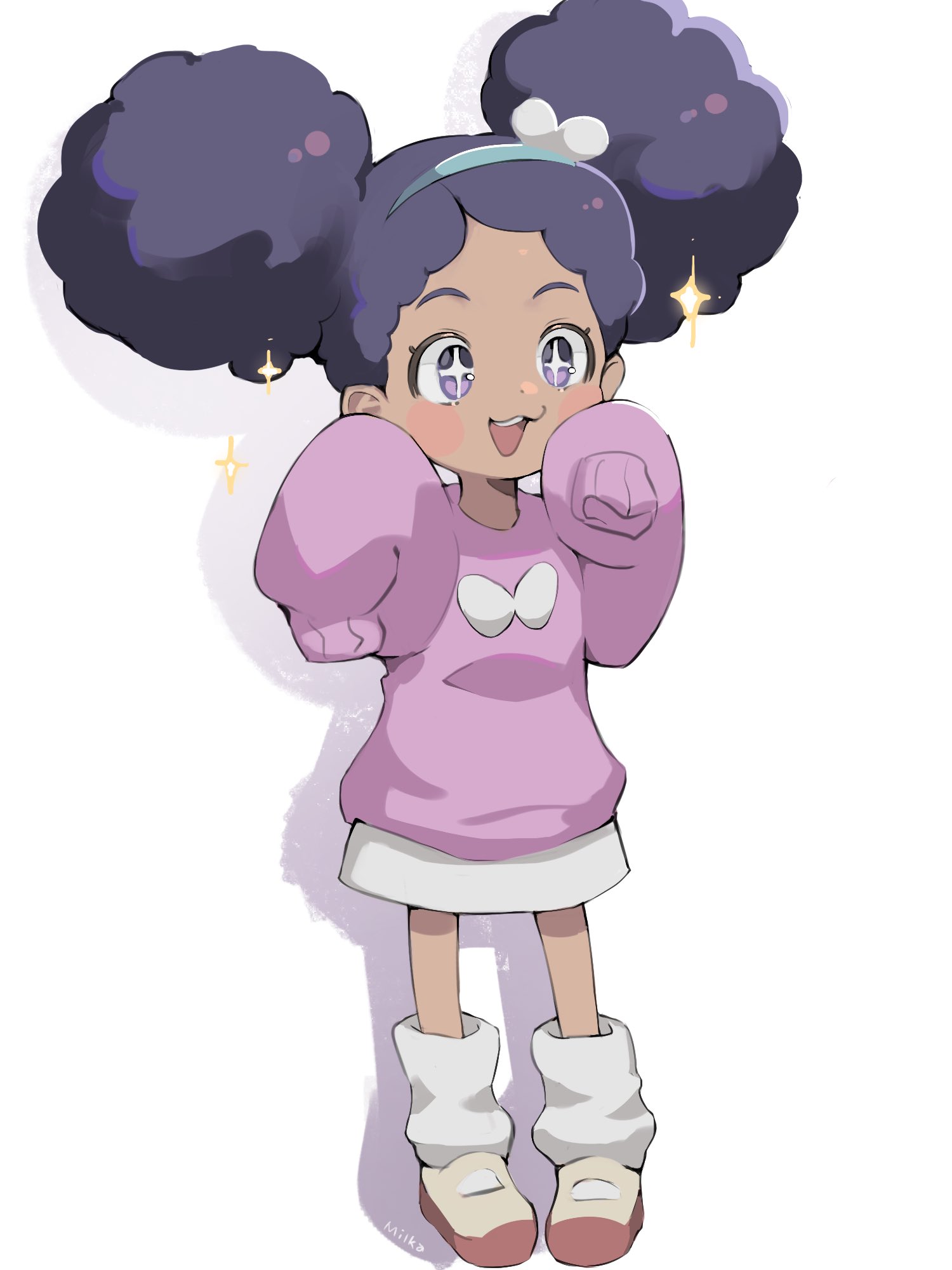 +_+ 1girl :d big_hair blush_stickers bow child commentary dark-skinned_female dark_skin eyelashes full_body green_hairband hairband happy highres long_sleeves loose_socks milka_(milk4ppl) nintendo open_mouth pigeon-toed pokemon pokemon_(anime) poketoon purple_eyes purple_sweater shoes simple_background skirt sleeves_past_fingers sleeves_past_wrists smile socks solo sparkle standing sweater teeth tongue upper_teeth_only vashti_(pokemon) white_background