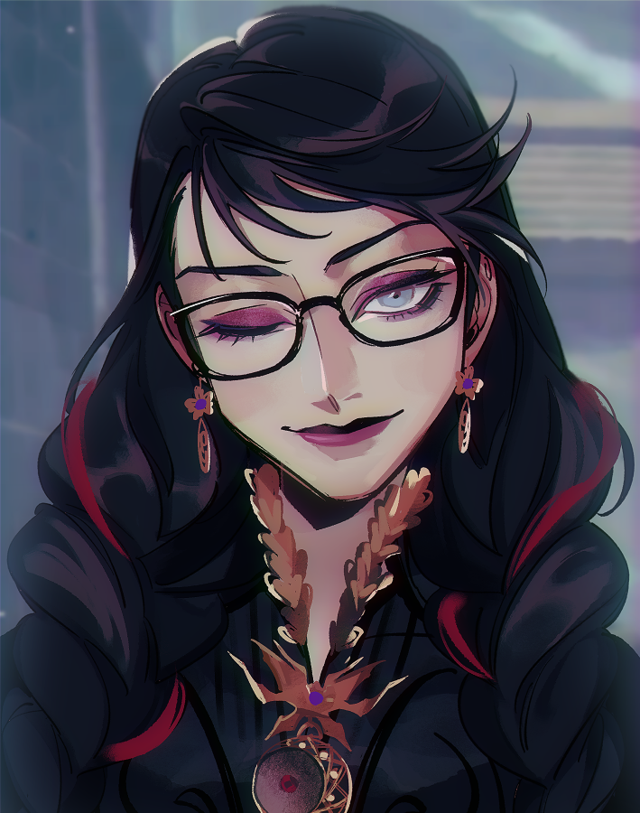 1girl bayonetta bayonetta_(series) bayonetta_3 black-framed_eyewear black_hair blue_eyes earrings eyeshadow glasses grin jewelry lipstick long_hair looking_at_viewer makeup maplekeurig multicolored_hair one_eye_closed red_hair sega smile solo streaked_hair wink