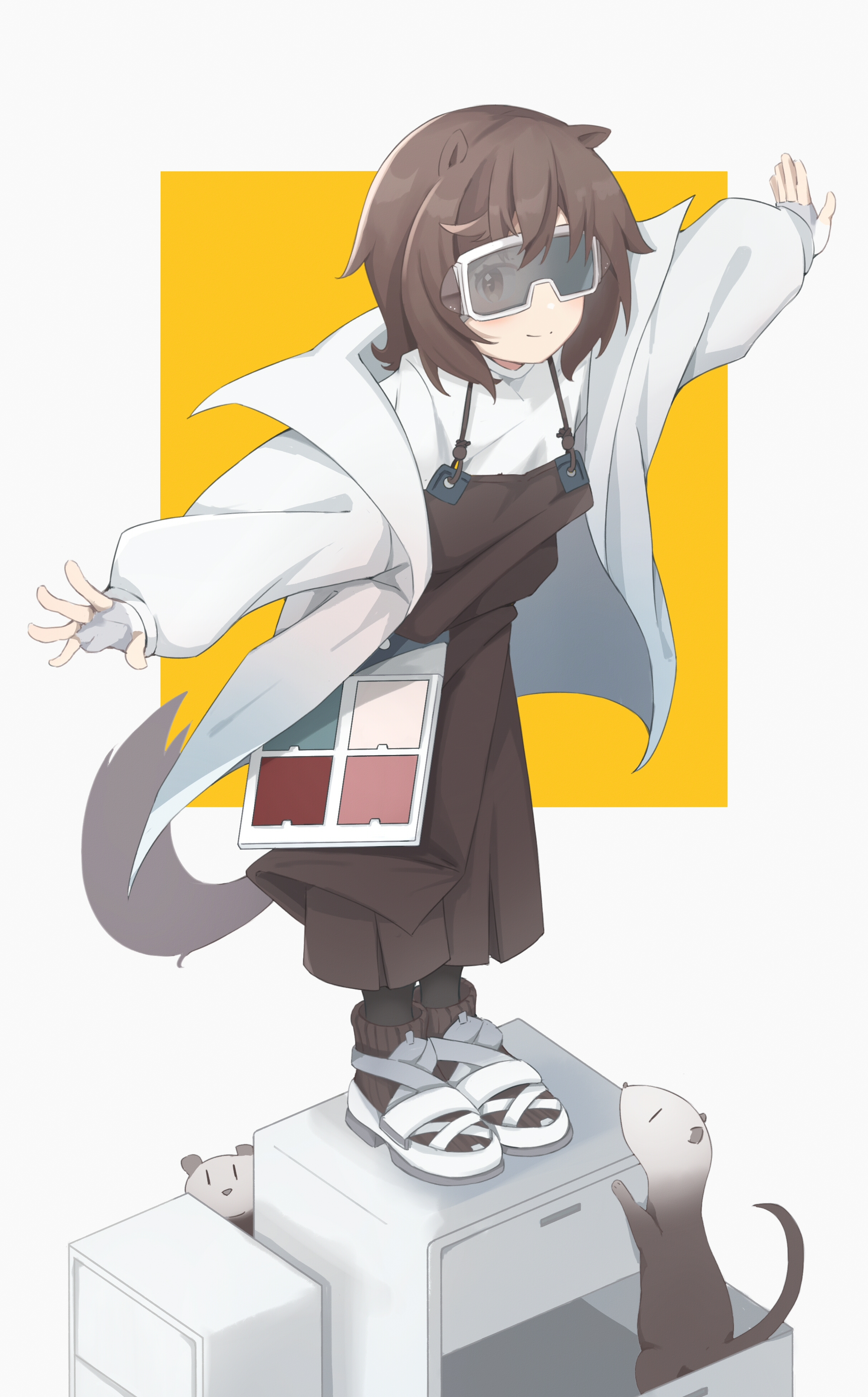 1girl absurdres animal animal_ears arknights black_socks brown_eyes brown_hair brown_overalls full_body goggles highres jacket looking_at_viewer nigakl open_clothes open_jacket otter otter_ears otter_girl otter_tail overalls roberta_(arknights) shirt short_hair simple_background smile socks solo split_mouth standing t-pose tail two-tone_background white_background white_footwear white_jacket white_shirt yellow_background