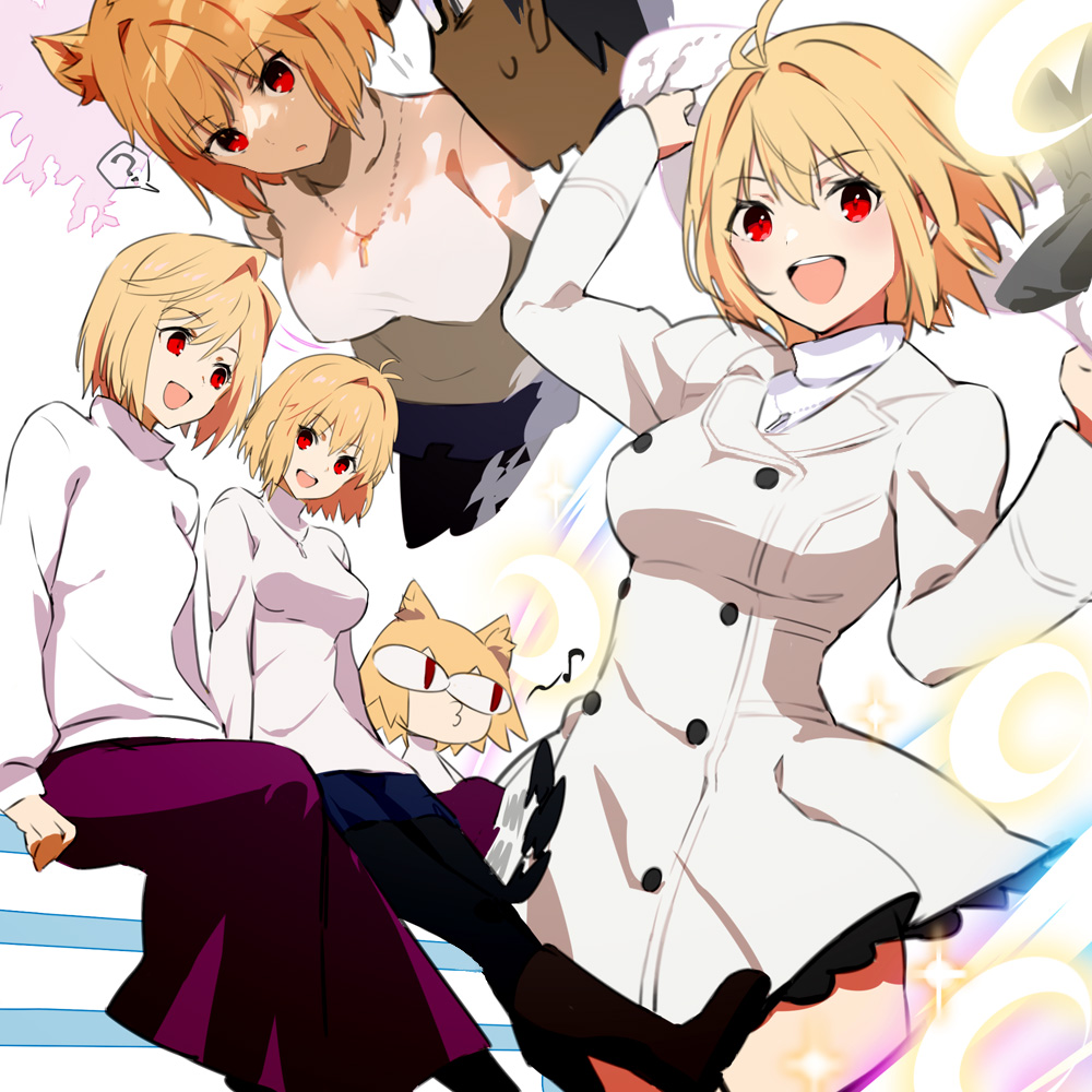 1boy 1girl :d ? arcueid_brunestud blonde_hair blue_pants boots breasts coat commentary_request crescent dual_persona gabu_(az210309) hands_up jewelry looking_at_viewer medium_breasts necklace neco-arc open_mouth pants pantyhose purple_skirt red_eyes short_hair skirt smile spoken_question_mark sweater tohno_shiki tsukihime tsukihime_(remake) white_coat white_sweater