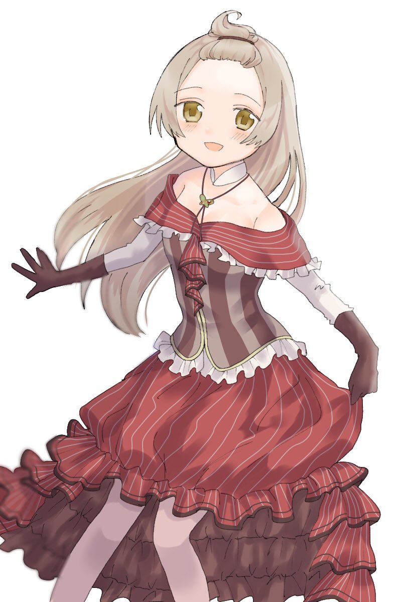 1girl azumi_hagumu bangs_pinned_back bare_shoulders brown_eyes brown_hair comet543 detached_collar dress gloves highres jewelry long_dress long_hair looking_at_viewer magia_record:_mahou_shoujo_madoka_magica_gaiden magical_girl mahou_shoujo_madoka_magica necklace off-shoulder_dress off_shoulder open_mouth smile solo