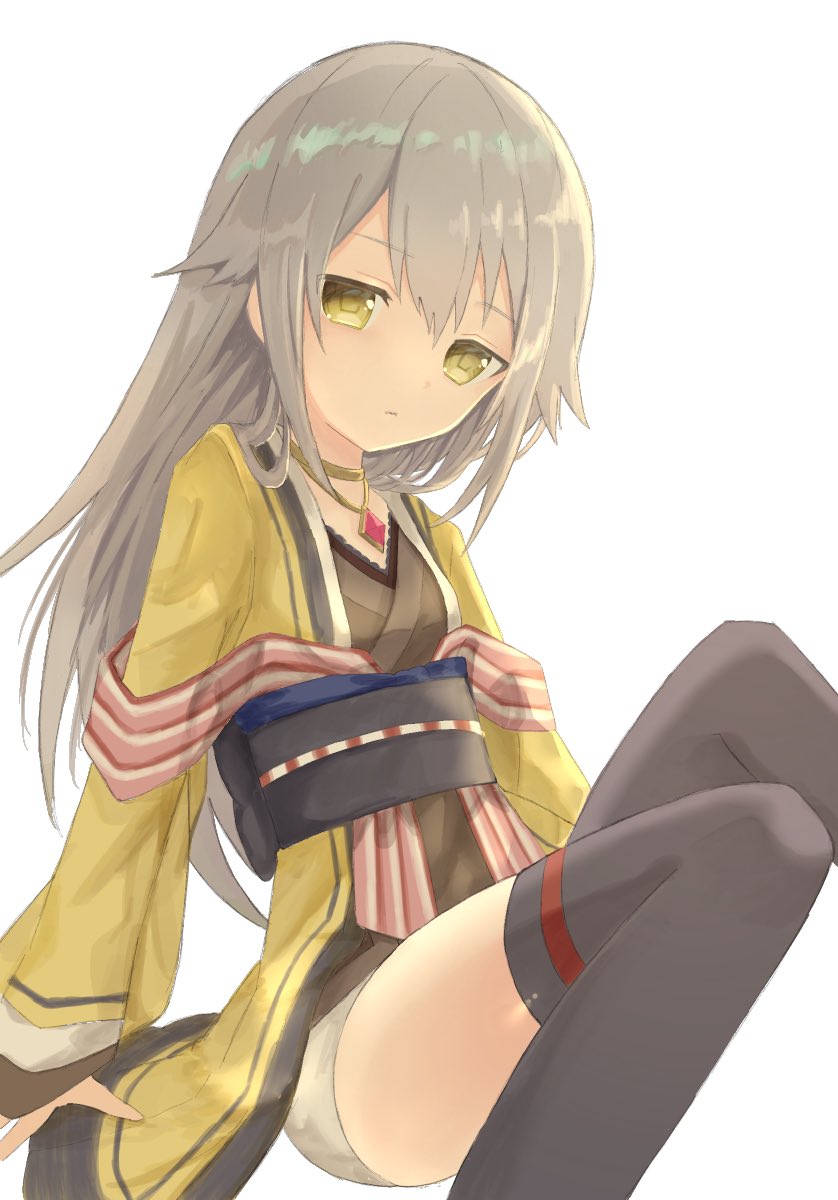 1girl comet543 hair_between_eyes highres japanese_clothes kureha_yuna long_hair long_sleeves looking_at_viewer magia_record:_mahou_shoujo_madoka_magica_gaiden magical_girl mahou_shoujo_madoka_magica open_mouth sash shorts silver_hair solo soul_gem thighhighs white_background wide_sleeves yellow_eyes