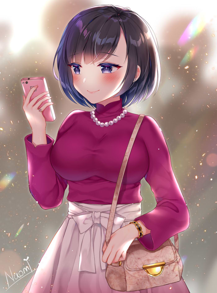 1girl bag black_hair blouse blue_eyes blush bow skirt_bow bracelet breasts cellphone handbag jewelry large_breasts lens_flare long_sleeves looking_at_phone naomi_(fantasia) necklace original pearl_necklace phone red_shirt ring shirt short_hair skirt smartphone smile solo swept_bangs white_skirt