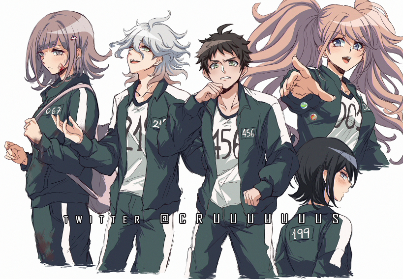 2boys 3girls :d abdul_ali abdul_ali_(cosplay) ahoge alternate_costume backpack bag blonde_hair blue_eyes brown_hair cho_sang-woo cho_sang-woo_(cosplay) collarbone cosplay criis-chan cropped_legs danganronpa:_trigger_happy_havoc danganronpa_(series) danganronpa_2:_goodbye_despair enoshima_junko green_eyes green_jacket green_pants grey_eyes grey_hair hair_ornament hinata_hajime ikusaba_mukuro jacket kang_sae-byeok kang_sae-byeok_(cosplay) komaeda_nagito long_hair looking_at_viewer marble_(toy) multicolored_jacket multiple_boys multiple_girls nanami_chiaki oh_il-nam oh_il-nam_(cosplay) open_clothes open_jacket open_mouth pants pink_hair pointing pointing_at_viewer seong_gi-hun seong_gi-hun_(cosplay) shirt short_hair smile squid_game teeth twintails two-tone_jacket two-tone_pants upper_teeth_only white_pants white_shirt