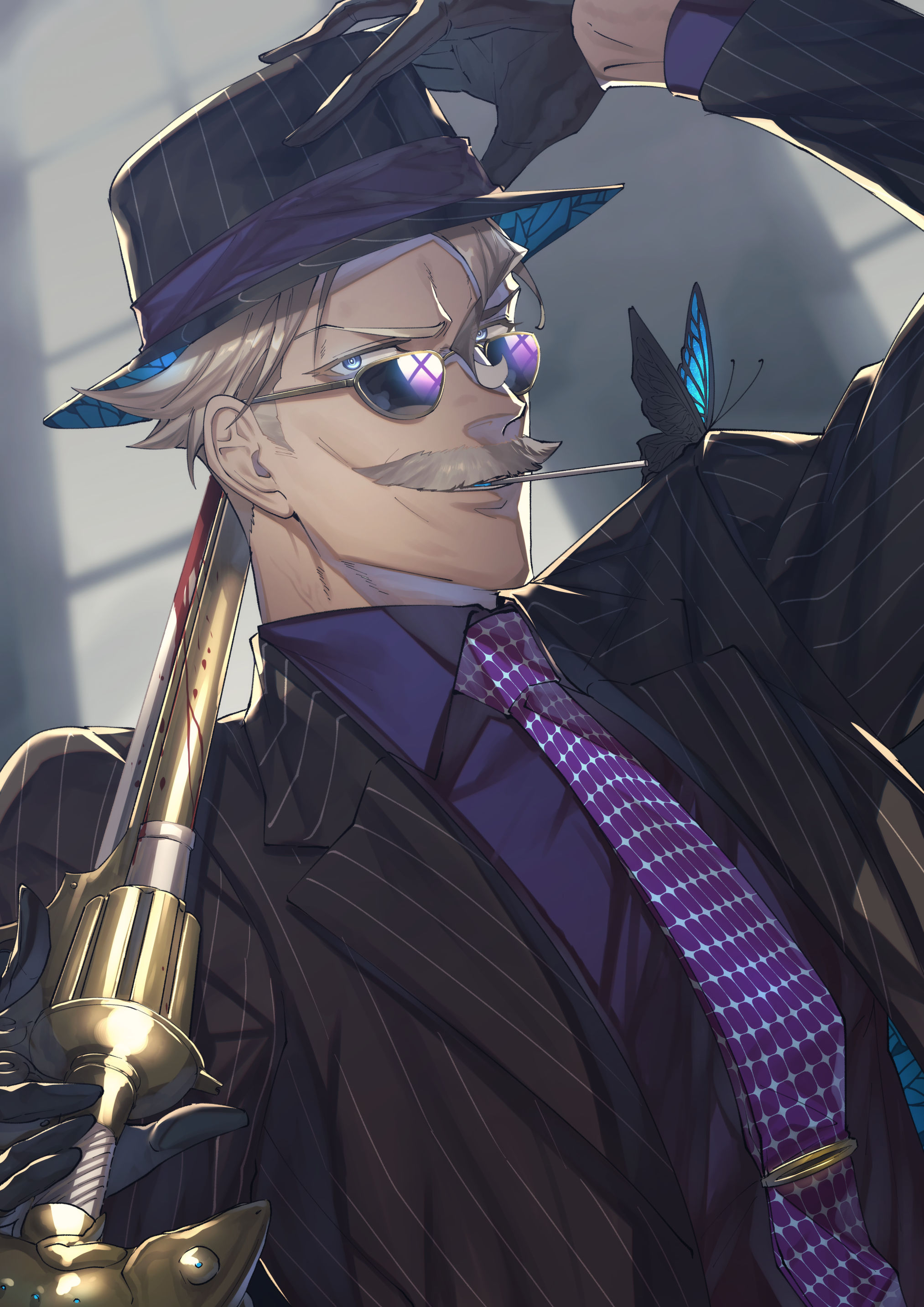1boy absurdres adjusting_clothes adjusting_headwear alternate_costume black_gloves black_hat black_suit blood bloody_weapon blue_eyes bug butterfly candy cane commentary_request facial_hair fate/grand_order fate_(series) food food_in_mouth formal_clothes gloves grey_hair hat highres holding holding_cane in_mouth insect james_moriarty_(archer)_(fate) lollipop lollipop_in_mouth looking_at_viewer male_focus mustache necktie pinstripe_pattern pinstripe_suit porkpie_hat purple_necktie purple_shirt shirt solo striped suit sunglasses suzuki_rui upper_body veins weapon window