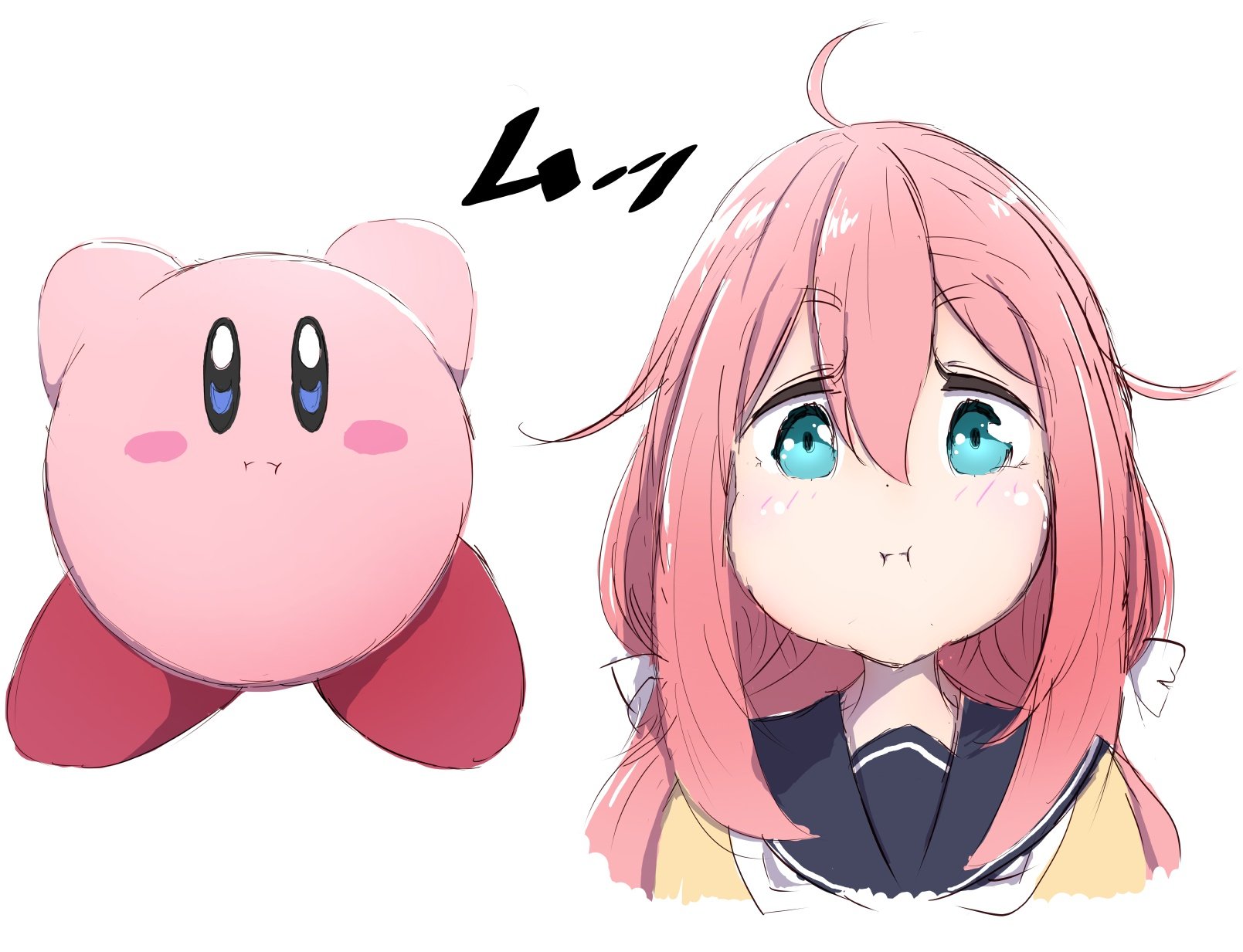 1girl 1other ahoge aqua_eyes beige_serafuku blue_eyes blush bow hair_between_eyes hair_bow hair_intakes highres kagamihara_nadeshiko kirby kirby_(series) long_bangs long_hair neckerchief nintendo pink_hair puffy_cheeks school_uniform serafuku shiny_skin short_eyebrows simple_background sketch syumashi trait_connection white_background white_bow yurucamp