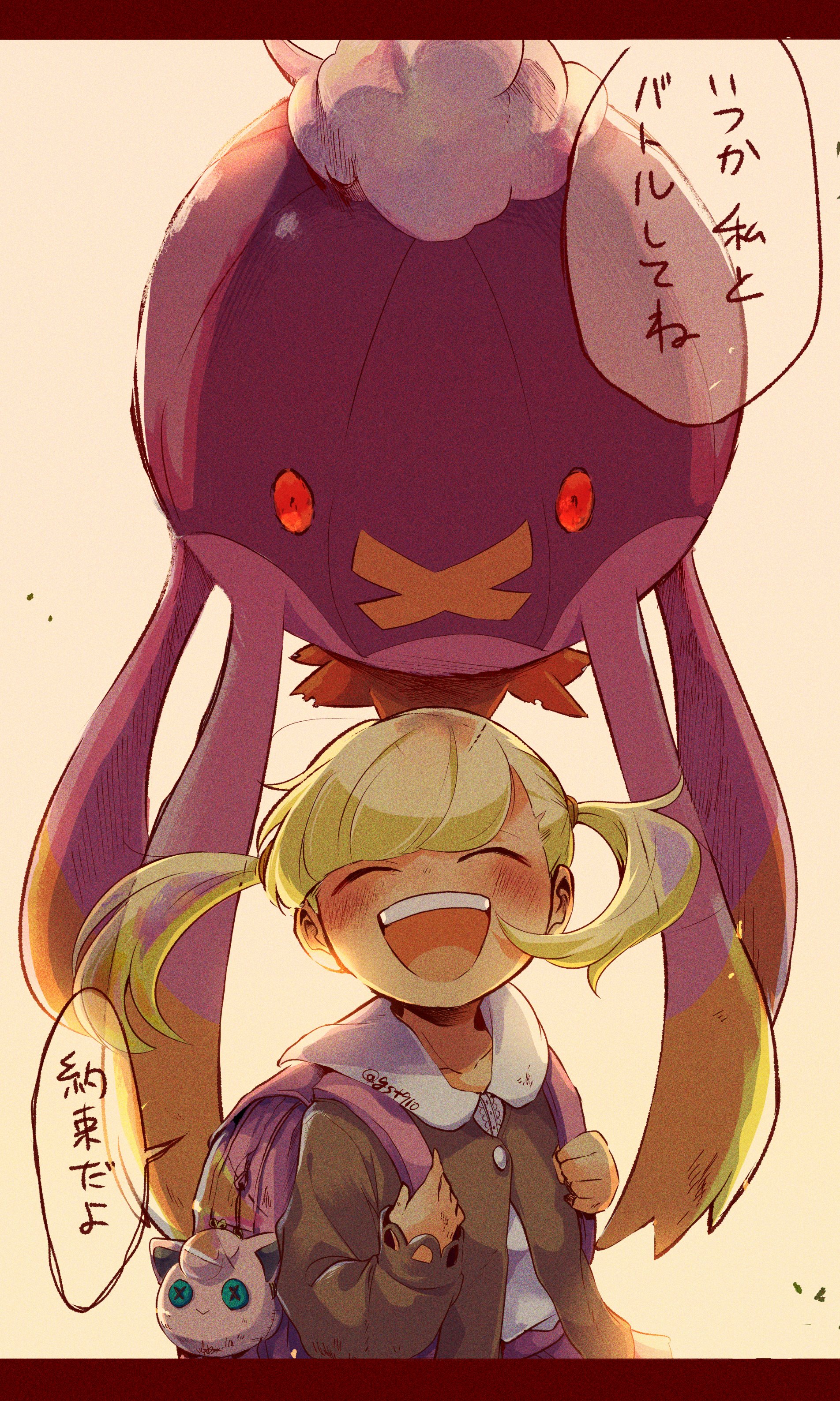 1girl :d absurdres backpack bag blonde_hair blush character_doll closed_eyes commentary_request doll drifblim facing_viewer floating_hair gen_1_pokemon gen_4_pokemon highres holding_strap jigglypuff kudou_(gst910) letterboxed long_sleeves nintendo open_mouth pokemon pokemon_(creature) pokemon_x_and_y preschooler_(pokemon) purple_bag smile speech_bubble teeth tongue translation_request twintails upper_body upper_teeth_only