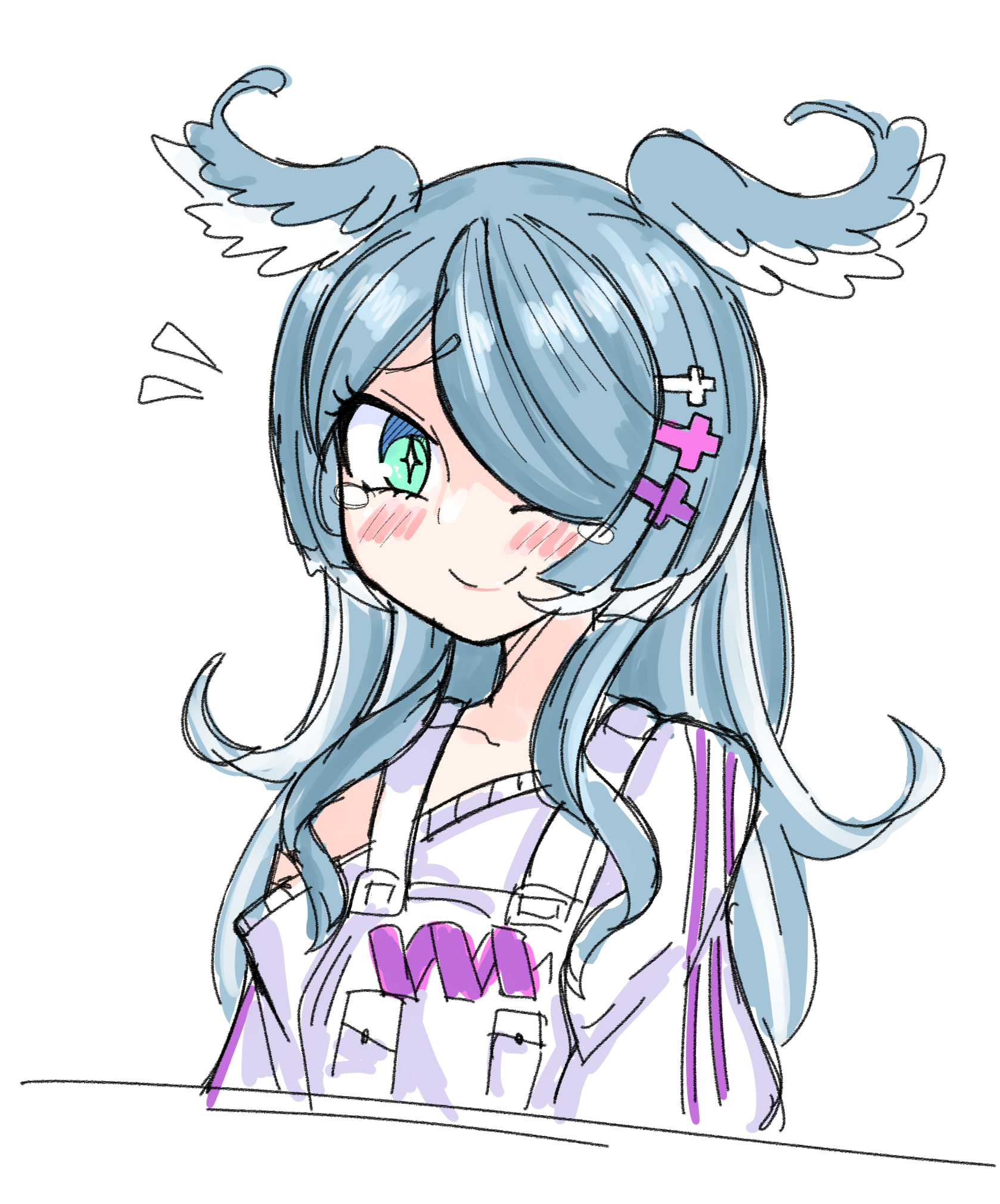 +_+ 1girl archived_source blue_eyes blush dork_(_dorku) drawfag elira_pendora head_wings highres long_hair nijisanji nijisanji_en off_shoulder one_eye_covered overalls sketch smile solo sweater virtual_youtuber white_background white_overalls white_sweater wings