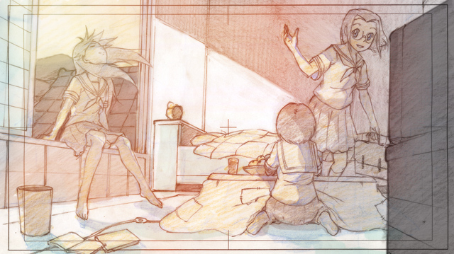 00s 3girls barefoot feet female_focus glasses hitotsubashi_yurie indoors kamichu! long_hair monochrome multiple_girls production_art saegusa_matsuri saegusa_miko school_uniform serafuku shijou_mitsue shirt short_hair sitting sketch skirt standing toes