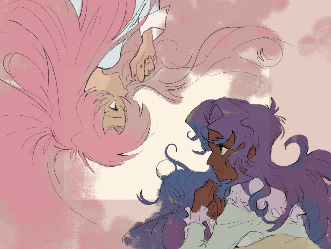 2girls blue_eyes dark-skinned_female dark_skin green_eyes himemiya_anthy long_hair multiple_girls pajamas parted_bangs pink_hair profile purple_hair ribitta shoujo_kakumei_utena tenjou_utena wavy_hair